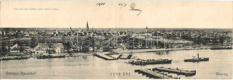 Újvidék, Novi Sad; Látkép, gőzhajó, kiadja Singer József, kétlapos panorámalap / general view, steamship, 2-tiled panoramacard (hajtásnál szakadt / bent til broken)