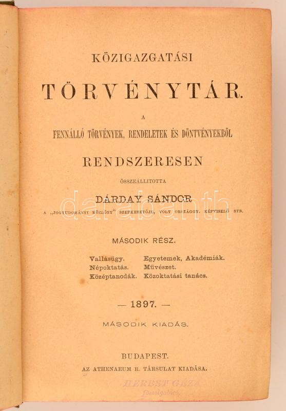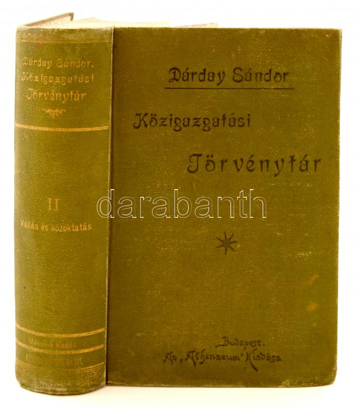 Dárday Sándor: Közigazgatási törvénytár. A fennálló törvények, rendeletek és döntvényekből rendszeresen. Összeállította: Dárday Sándor. Második rész. Vallásügy. Népoktatás. Középtandodák. Egyetemek, Akadémiák. Művészet. Közoktatási tanács. Budapest, 1897, Athenaeum Rt.,1160 p. Második kiadás. Kiadói picit kopottas aranyozott gerincű egészvászon kötés. Jó állapotban.