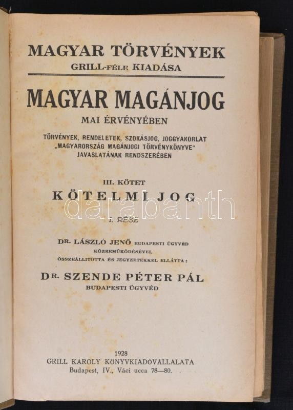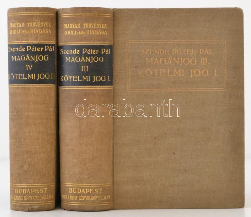 Dr. Szende Péter Pál, Dr. László Jenő, : Magyar magánjog mai érvényében III. kötet. Kötelmi jog I-II. Budapest, 1928, Grill Károly, XXXII+831+IX+725 p. Kiadói egészvászon kötés, picit kopott borítókkal, picit foltos védő-, és előzéklapokkal, picit laza fűzéssel, jó állapotban.