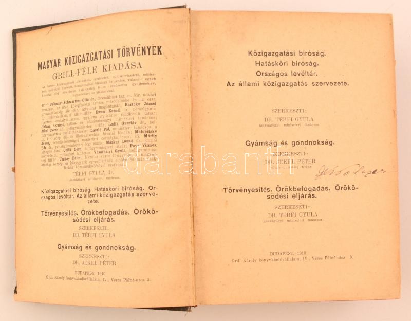 Dr. Térfi Gyula-Dr. Jekel Péter (szerk.): Magyar közigazgatási törvények. Közigazgatási bíróság. Hatásköri bíróság. Országos levéltár. Az állami közigazgatás szervezete. Gyámság és gondnokság. Törvényesítés. Örökbefogadás. Örökösödési eljárás.
