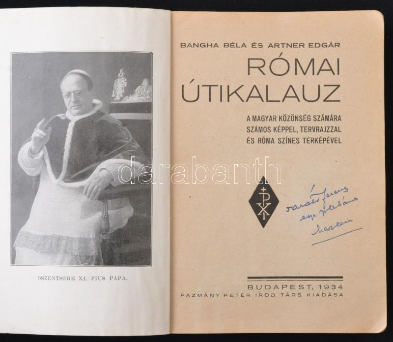 Bangha Béla, Artner Tivadar: Római utikalauz. A magyar közönség számára, számos képpel, tervrajzzal, és Róma színes térképével. Budapest, 1934, Pázmány Péter Irod. Társ. Kiadói papírkötés, megviselt állapotban.