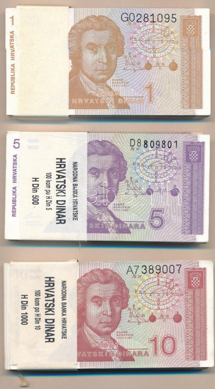 Leírás: Horvátország 1991. 1D (~105x) házi kötegelőben, sorszámkövetők + 1991. 10D (9x) + 1991. 5D (~100x) eredeti "NARODNA BANKA HRVATSKE" feliratú banki kötegelőbe, sorszámkövetők + 1991. 10D (~90x) eredeti "NARODNA BANKA HRVATSKE" feliratú banki kötegelőbe, sorszámkövetők T:I,I-