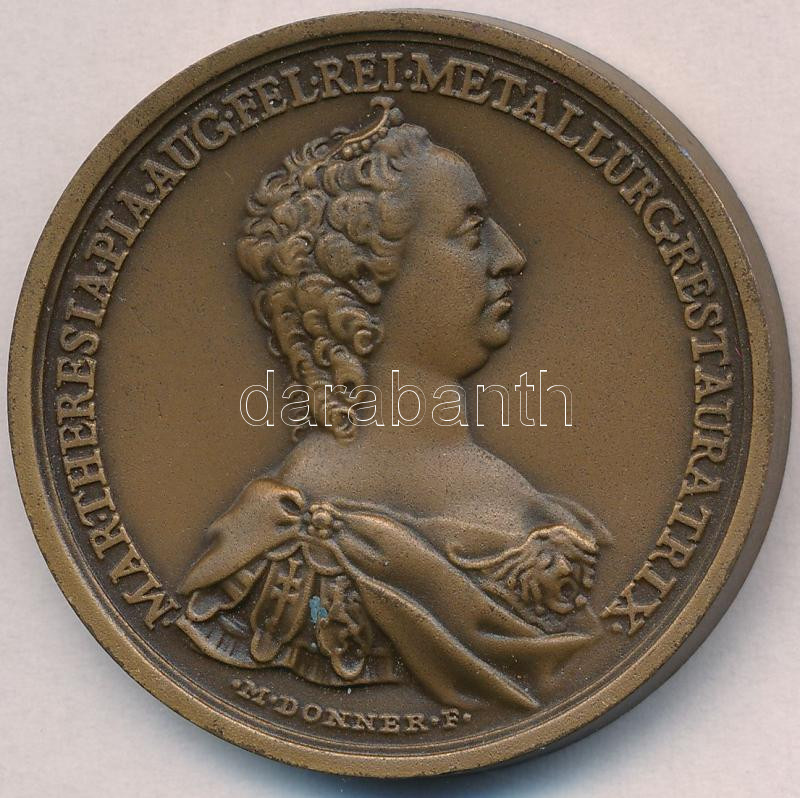DN "Mária Terézia / A kémlészettan tanulmányi érme" Br emlékérem, a Selmecbányai Bányászati Akadémia tanulmányi éremsorozata, Kohász jutalomérme, utánveret. "MAR THERESIA PIA AUG FEL REI METALLURG RESTAURATRIX" Szign.: M. Donner F. (45mm) T:2