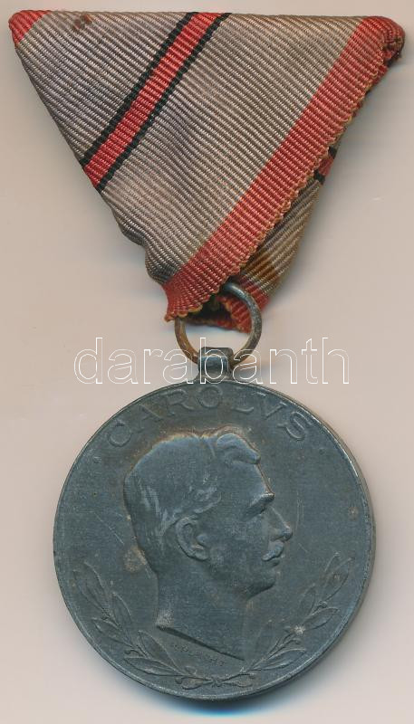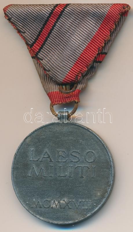 Hungary 1918. "Wound Medal" zinc decoration with ribbon after first wound, with "WAA 918" on edge. Sign.: R. Placht C:XF