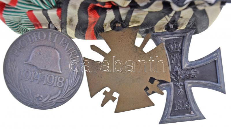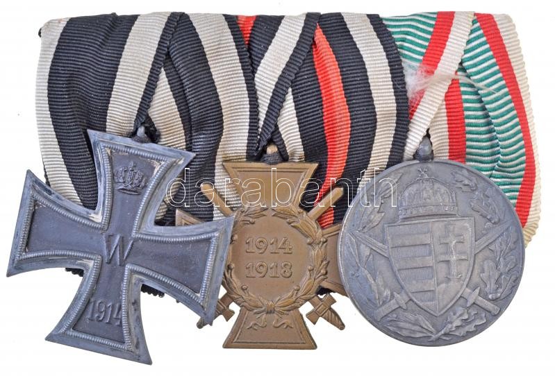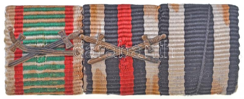 Német Birodalom 1914. "Vaskereszt 2. osztály" kitüntetés mellszalaggal + Német 3. Birodalom 1934. "Első Világháborús Érdemkereszt 1914-1918" kitüntetés mellszalagon harcolóknak, hátoldalán "OULC?" jelzéssel + Magyarország 1929. "Magyar Háborús Emlékérem kardokkal, sisakkal" ezüstözött Br kitüntetés mellszalaggal, "BRONZ" fémjel a koszorú alatt; mindhárom kitüntetés összevarrva, szalagsávok egyben kis fém csaton, két miniatűr kard rajtuk, egyik kissé hajlott T:2