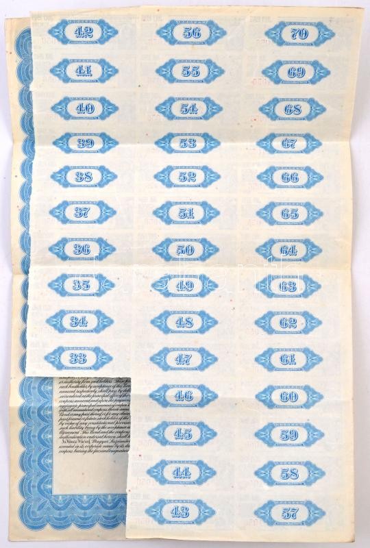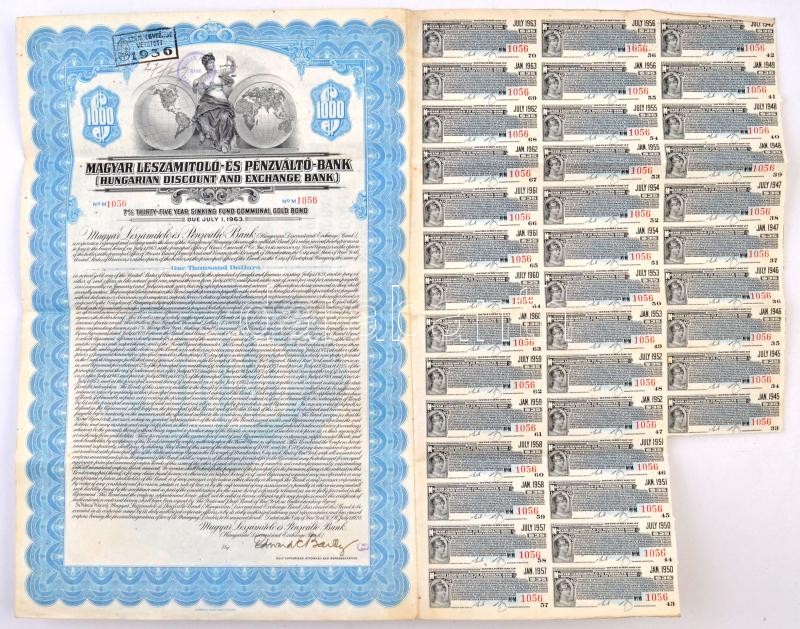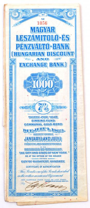 Amerikai Egyesült Államok / New York / Magyarország 1928. "Magyar Leszámítoló- és Pénzváltó-Bank" 7%-os, 35 éves lejáratú kötvénye 1000$-ról szelvényekkel, bélyegzésekkel T:III tűnyom