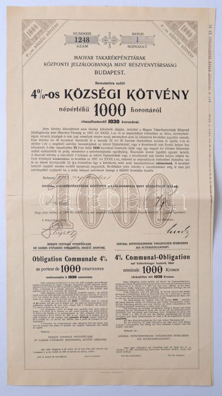 Budapest 1903. "Magyar Takarékpénztárak Központi Jelzálogbankja mint Részvénytársaság Budapest" 4%-os községi kötvénye 1000K-ról, szárazpecséttel T:II- kis szakadás a hajtás mentén