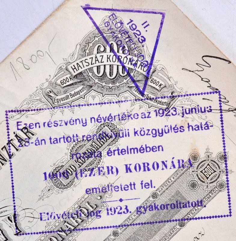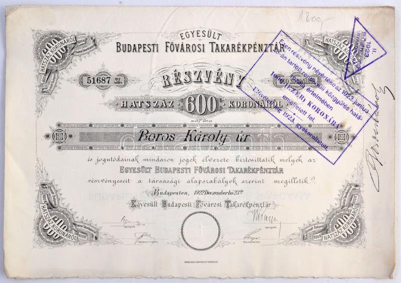 Budapest 1922. "Egyesült Fővárosi Takarékpénztár" részvénye 600K-ról, ... https://www.darabanth.com/hu/277-Gyorsarveres/277.0/Numizmatika/Reszvenyek-es-sorsjegyek~400005/Budapest-1922-Egyesult-Fovarosi-Takarekpenztar-reszvenye-600K-rol-felulbelyegzessel-~II1419215