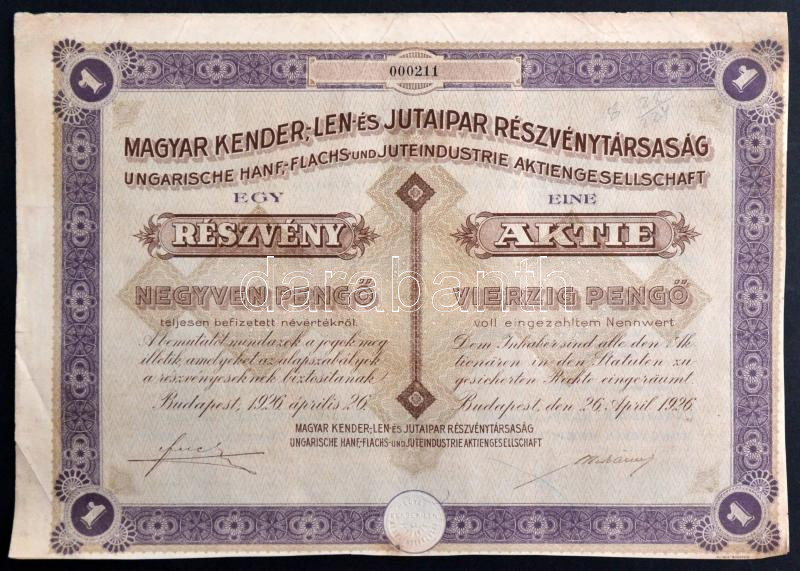 Budapest 1926. "Magyar Kender,-Len- és Jutaipar Részvénytársaság" rész... https://www.darabanth.com/hu/277-Gyorsarveres/277.0/Numizmatika/Reszvenyek-es-sorsjegyek~400005/Budapest-1926-Magyar-Kender-Len-es-Jutaipar-Reszvenytarsasag-reszvenye-40P-rol-szelven~II1359160
