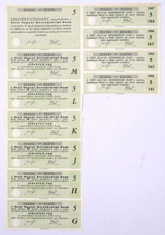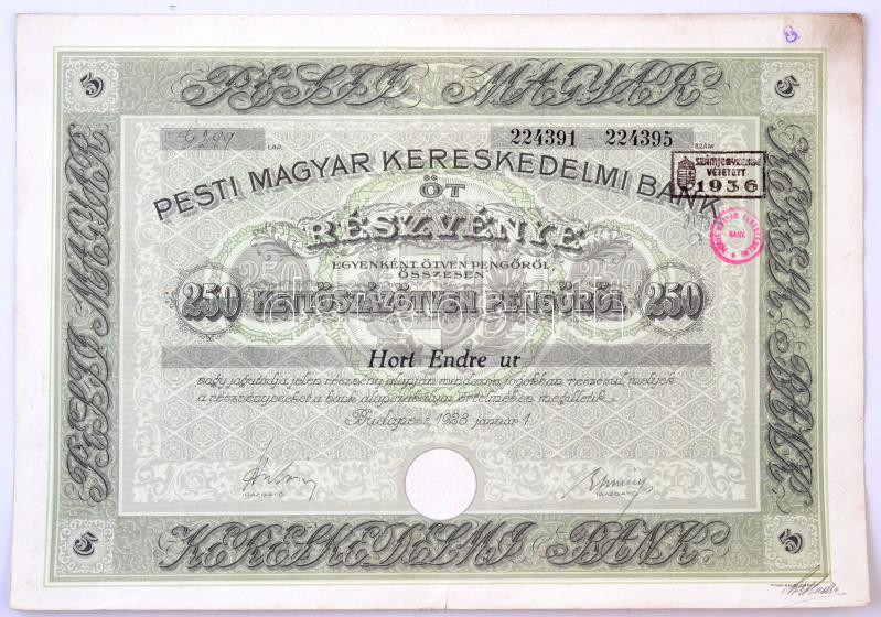 Leírás: Budapest 1928. "Pesti Magyar Kereskedelmi Bank" 5 részvénye egyben, egyenként 50P-ről, szárazpecséttel, bélyegzéssel, szelvényekkel T:III tűlyukak