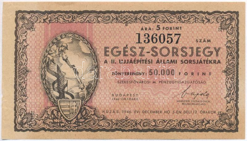 Budapest 1946. "Egész sorsjegy - II. Újjáépítési Állami sorsjáték" sor... https://www.darabanth.com/hu/277-Gyorsarveres/277.0/Numizmatika/Reszvenyek-es-sorsjegyek~400005/Budapest-1946-Egesz-sorsjegy--II-Ujjaepitesi-Allami-sorsjatek-sorsjegy-TII-szakadas~II1416241
