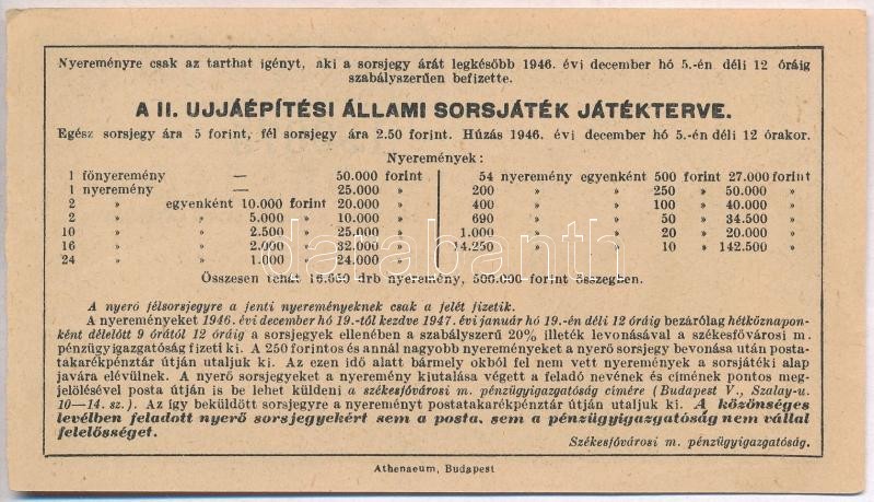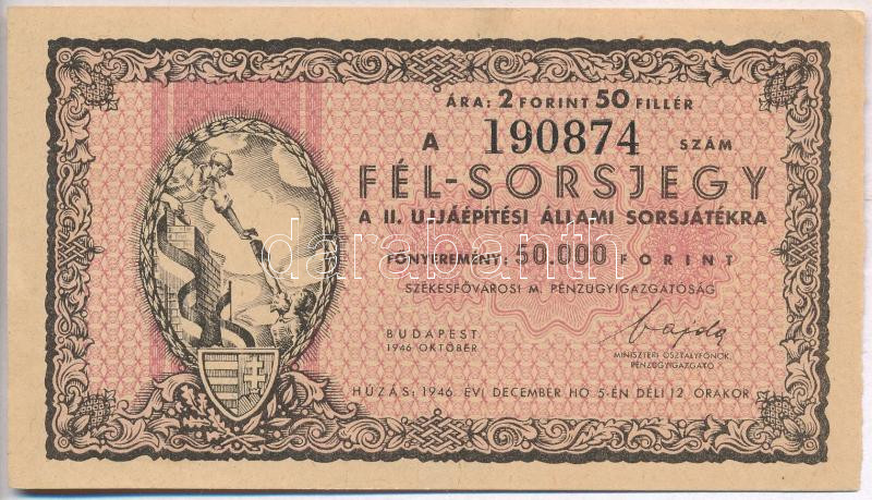 Leírás: Budapest 1946. "Fél sorsjegy - II. Újjáépítési Állami sorsjáték" sorsjegy T:II-