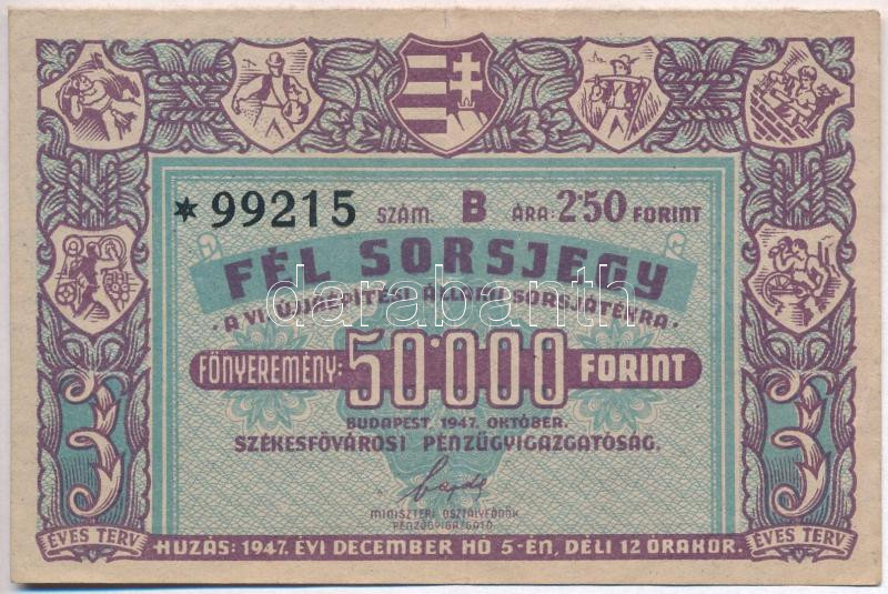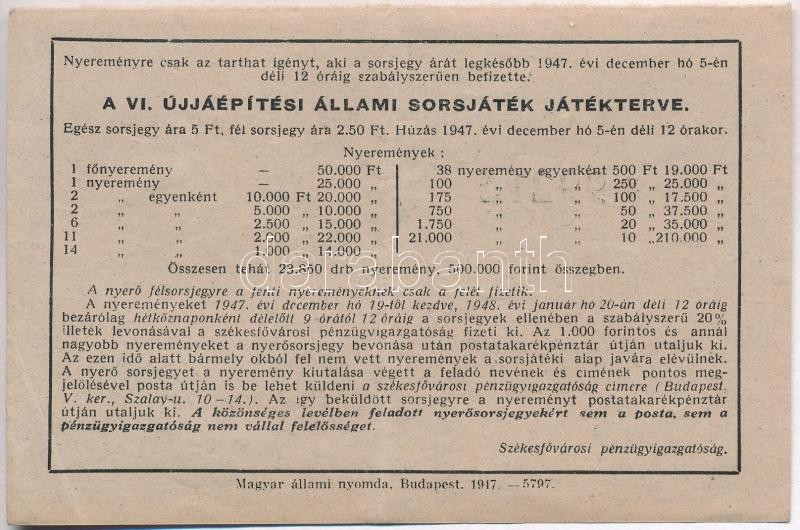 Leírás: Budapest 1947. "Fél sorsjegy - VI. Újjáépítési Állami sorsjáték" sorsjegy T:II-,III