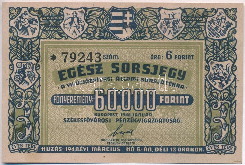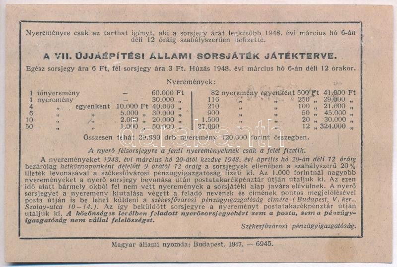Leírás: Budapest 1948. "Egész sorsjegy - VII. Újjáépítési Állami sorsjáték" sorsjegy T:II-