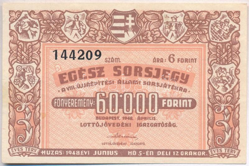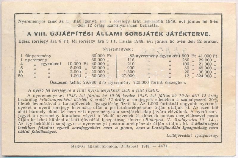 Leírás: Budapest 1948. "Egész sorsjegy - VIII. Újjáépítési Állami sorsjáték" sorsjegy T:III hátoldalán szennyeződés