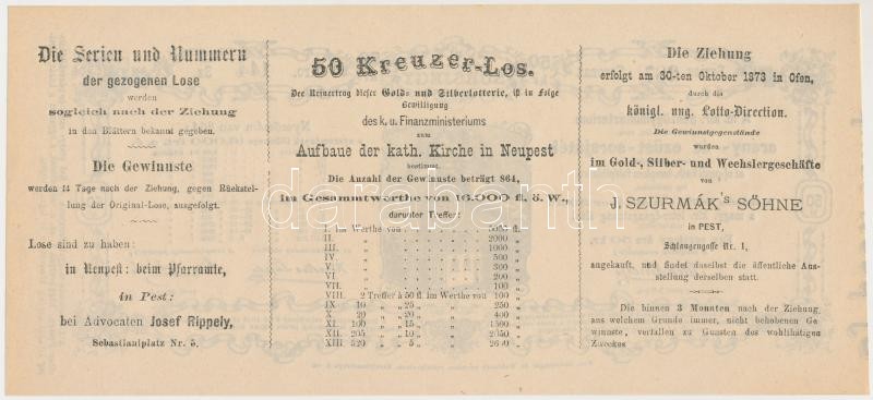 Budapest / Pest 1873. "A Magyar Királyi Pénzügyminisztérium arany- és ezüst sorsjátéka az Újpesti Katolikus Templom felépítésének javára" 50kr értékben T:I-,II