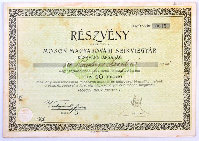 Moson, Mosonmagyaróvár 1927. "Moson-Magyaróvári Szikvizgyár Részvénytá... https://www.darabanth.com/hu/277-Gyorsarveres/277.0/Numizmatika/Reszvenyek-es-sorsjegyek~400005/Moson-Mosonmagyarovar-1927-Moson-Magyarovari-Szikvizgyar-Reszvenytarsasag-reszvenye-1~II1419236