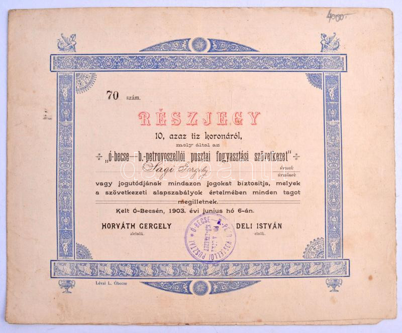 Leírás: Ó-Becse 1903. "Ó-becse-b.-petrovoszellói Pusztai Fogyasztási Szövetkezet" részjegye 10K-ról, szelvényekkel, bélyegzéssel T:II fo.