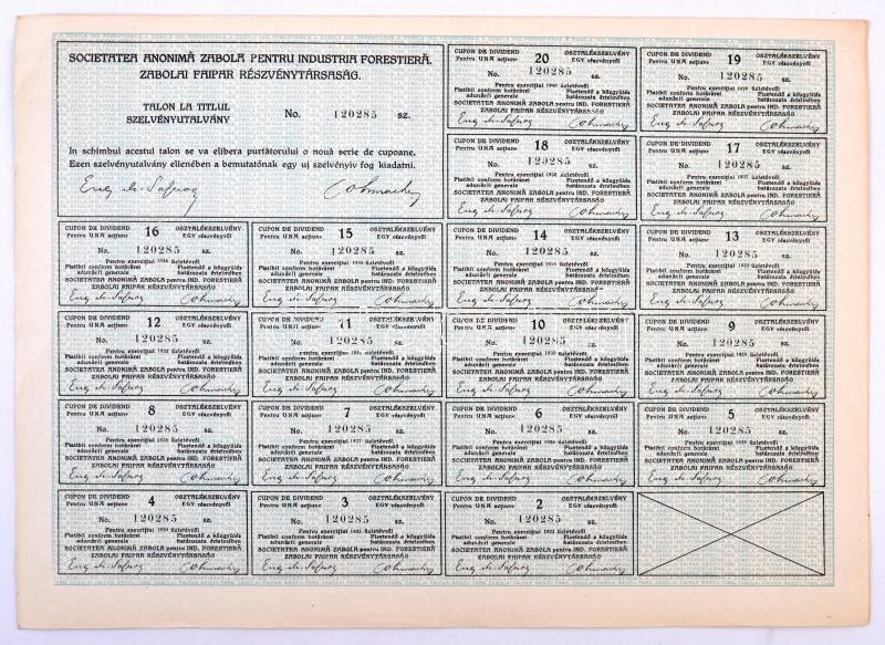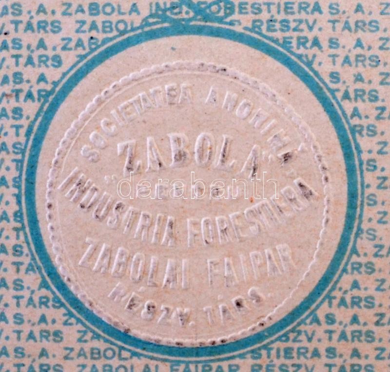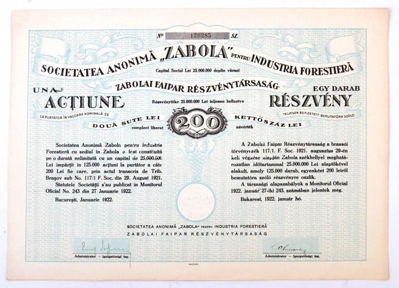 Románia / Bukarest 1922. "Zabolai Faipar Részvénytársaság" részvénye 200L-ről szelvényekkel, szárazpecséttel T:II