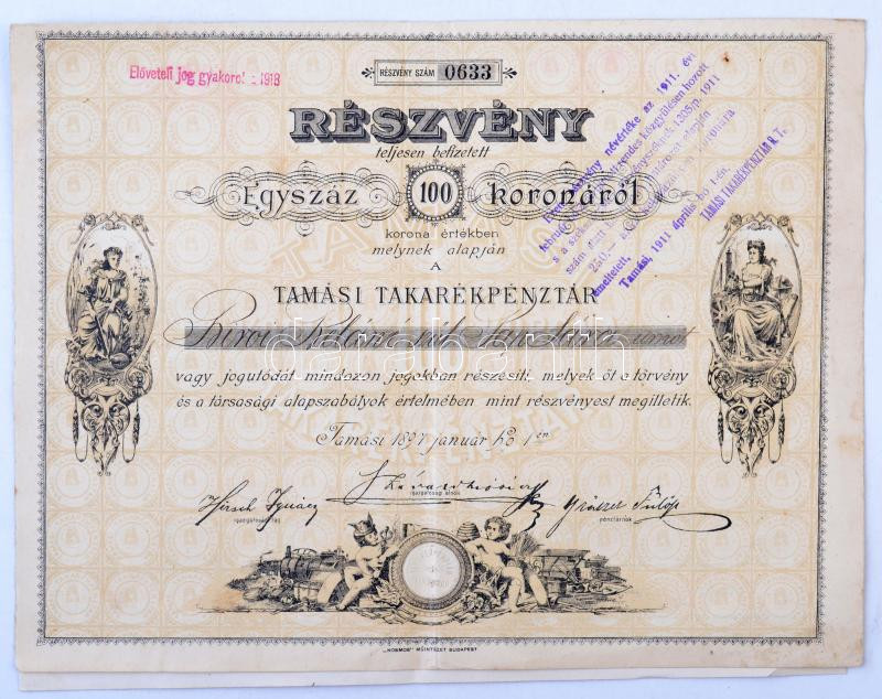 Tamási 1897. "A Tamási Takarékpénztár" részvénye 100K-ról szárazpecsét... https://www.darabanth.com/hu/277-Gyorsarveres/277.0/Numizmatika/Reszvenyek-es-sorsjegyek~400005/Tamasi-1897-A-Tamasi-Takarekpenztar-reszvenye-100K-rol-szarazpecsettel-felulbelyegzC3~II1425250