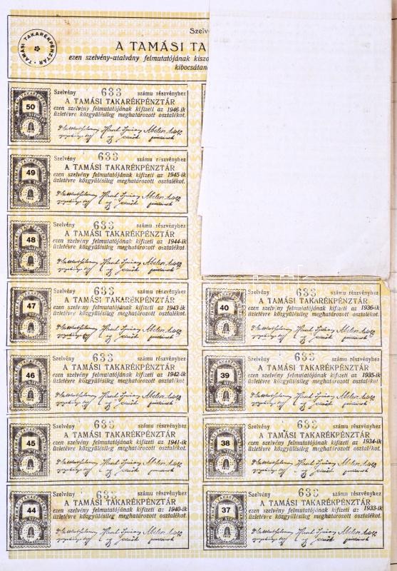Leírás: Tamási 1897. "A Tamási Takarékpénztár" részvénye 100K-ról szárazpecséttel, felülbélyegzéssel, szelvényekkel, a 30039. számú tétel sorszámkövető párja T:II-
