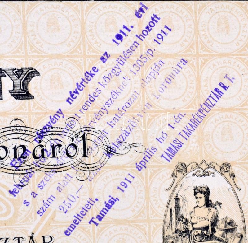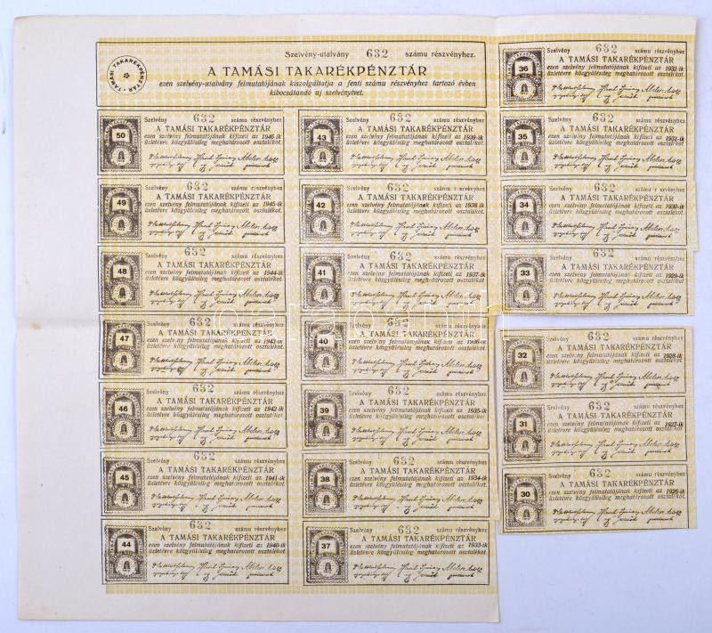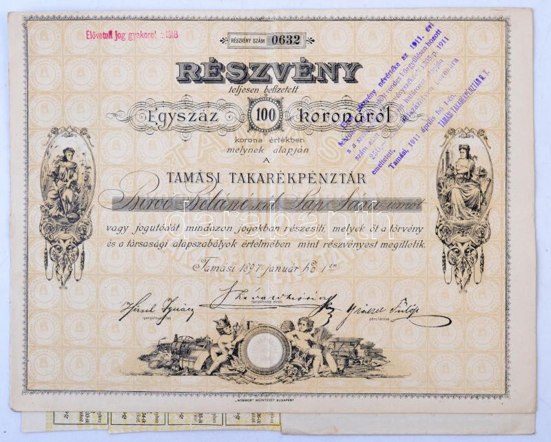 Leírás: Tamási 1897. "A Tamási Takarékpénztár" részvénye 100K-ról szárazpecséttel, felülbélyegzéssel, szelvényekkel, a 30038. számú tétel sorszámkövető párja T:II-