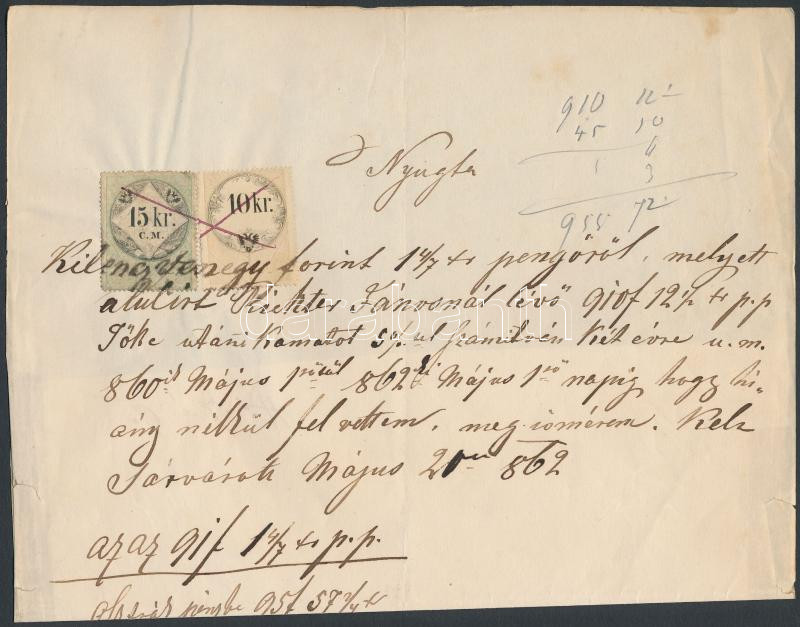 Leírás: 1862 Nyugta 15kr C.M. + 10kr okmánybélyeggel