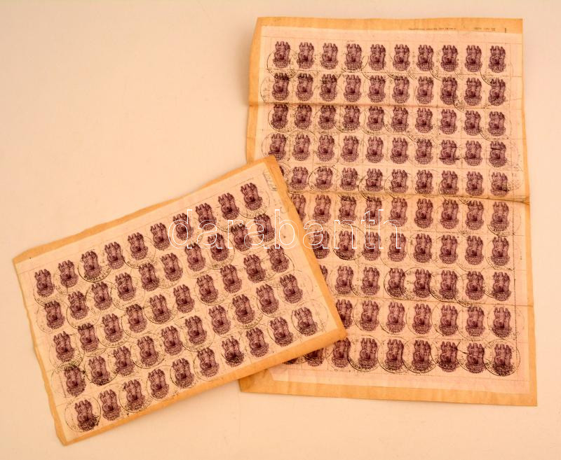 Leírás: 1945 Törvénykezési illetékbélyeg 500P 2 db százas ív ugyanazon papír két oldalára ragasztva + 50-es és 24-es ívdarab papírlapra ragasztva