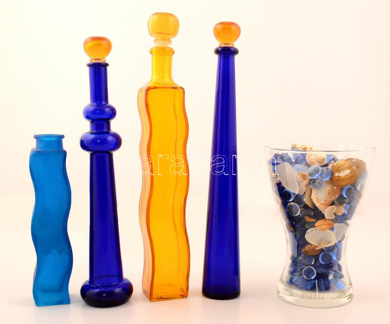 Leírás: Vegyes üveg tétel: kék olajos üvegek, üvegváza, benne kagylókkal, díszekkel