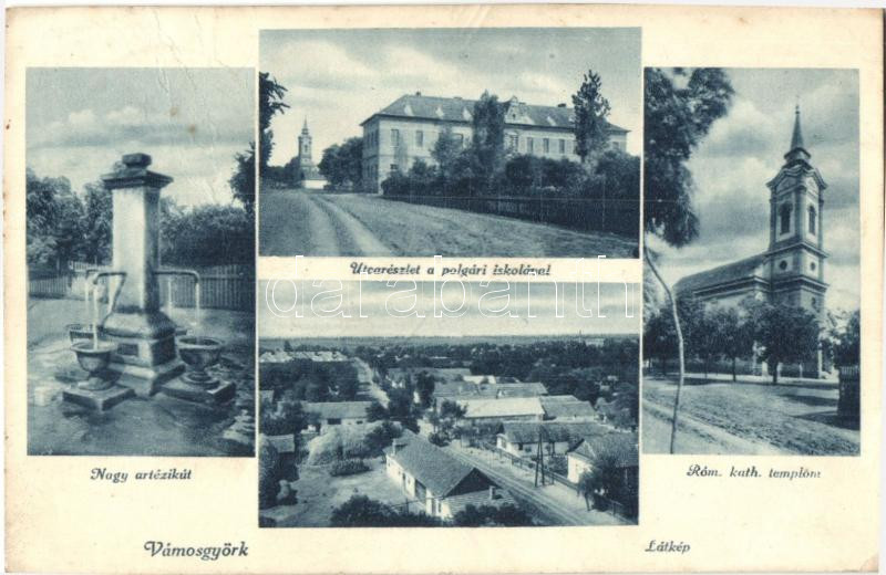 Leírás: Vámosgyörk, Nagy artézi kút, római katolikus templom, polgári iskola (fa)