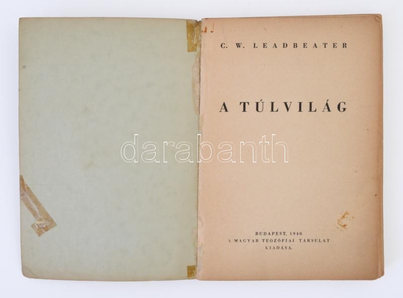 C.W. Leadbeater: A túlvilág. Budapest, 1940, Magyar Teozófiai Társulat. Kiadói papírkötés, némileg foltos és ragasztott borítóval, egyébként jó állapotban.