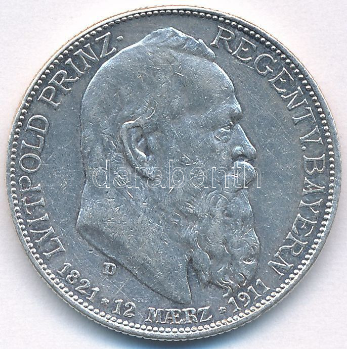 German Empire / Bavaria 1911D 2 Mark Ag "90th Birthday of Prince Regent Luitpold" C:XF,VF