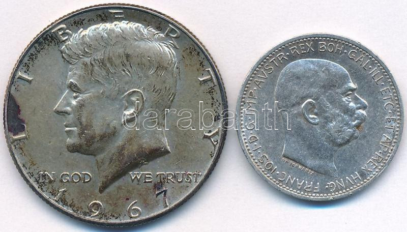 Vegyes: Amerikai Egyesült Államok 1967. 1/2$ Ag "Kennedy" + Ausztria 1915. 1K Ag "I. Ferenc József" T:2 patina