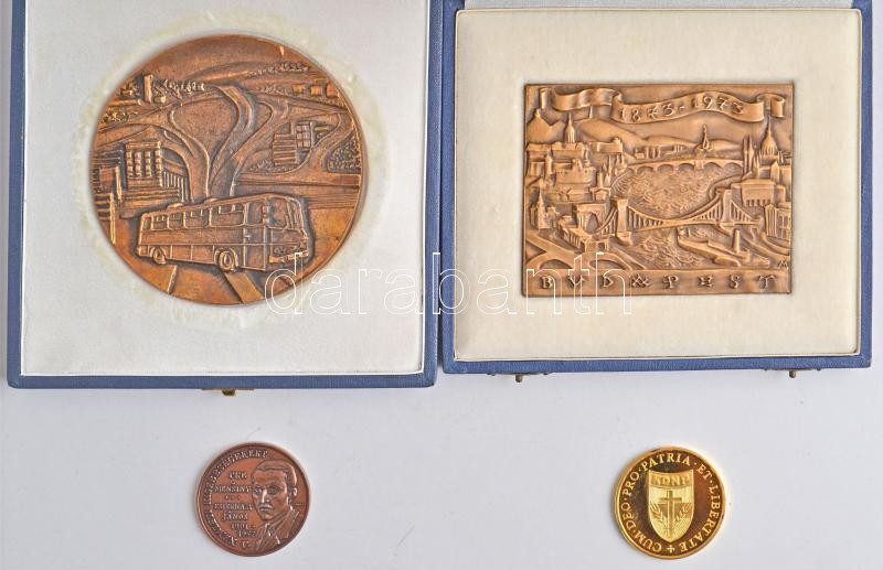 Madarassy Walter (1909-1994) 1973. "Budapest 1873-1973" Br emlékplakett, eredeti tokban + 1973. "Közlekedési és Szállítási Dolgozók Szakszervezete Fennállásának 75. évfordulójára" Br plakett, eredeti tokban + ~1970-1980. "Vezess Baleset Nélkül Mozgalom" Br emlékérem, eredeti tokban + ~1970-1980. "A Volán Feladataiban Végzett Eredményes Munkásságért" Br plakett, eredeti tokban T:2,2-