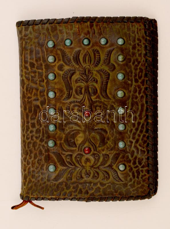 Kő berakásos bőr könyvtok, benne könyvvel, 23,5×18 cm https://www.darabanth.com/hu/279-Gyorsarveres/279.0/Festmeny-mutargy-papirregiseg-egyeb/Bolhapiac~11/Ko-berakasos-bor-konyvtok-benne-konyvvel-23-5C39718-cm~II1434464