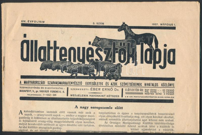 Leírás: 1937 az Állattenyésztők Lapja 14. évf. 5. száma érdekes írásokkal