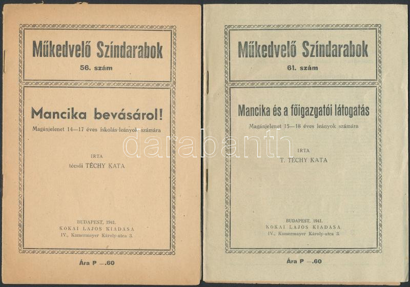 Leírás: 1941 a Műkedvelő színdarabok sorozat 56. és 61. száma (Mancika bevásárol!; Mancika és a főigazgatói látogatás), tűzött papírkötésben, jó állapotban