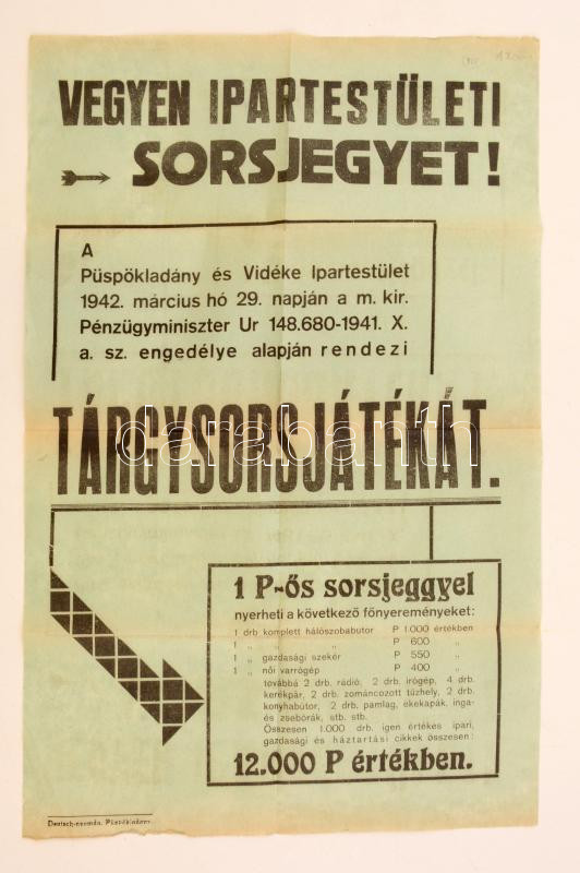 1942 "Vegyen ipartestületi sorsjegyet!", püspökladányi tárgysorsolás p... https://www.darabanth.com/hu/279-Gyorsarveres/279.0/Festmeny-mutargy-papirregiseg-egyeb/Nyomtatvanyok~27/1942-Vegyen-ipartestuleti-sorsjegyet-puspokladanyi-targysorsolas-plakatja-kis-gyurode~II1437068