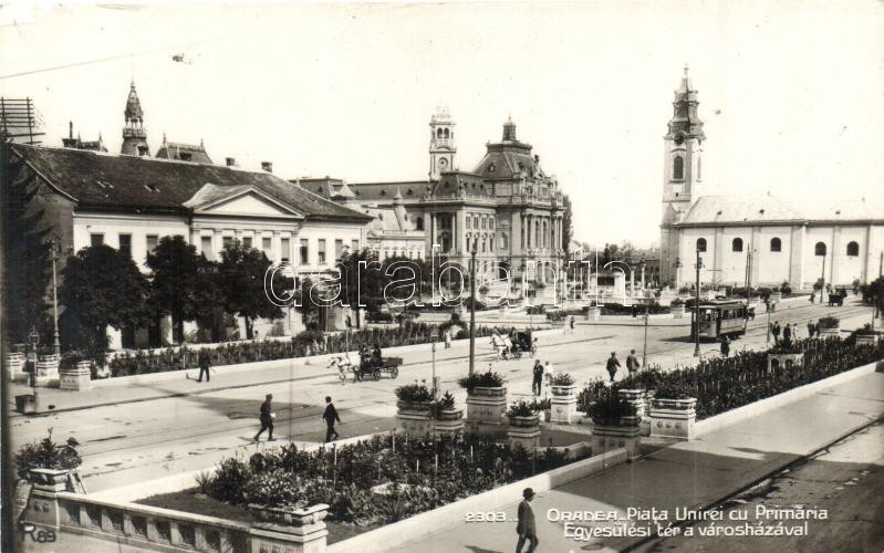 Nagyvárad, Oradea; Egyesülési tér, városháza, villamos / square, town ... https://www.darabanth.com/hu/279-Gyorsarveres/279.0/Kepeslapok/Erdely~300024/Nagyvarad-Oradea-Egyesulesi-ter-varoshaza-villamos-square-town-hall-tram-photo~II1435347