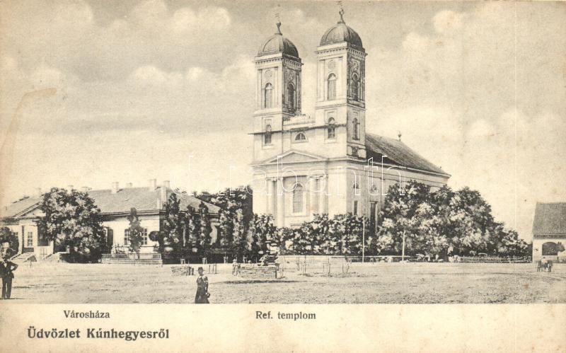 Leírás: Kunhegyes, Városháza, református templom, kiadja Farkas Sándor fényképész