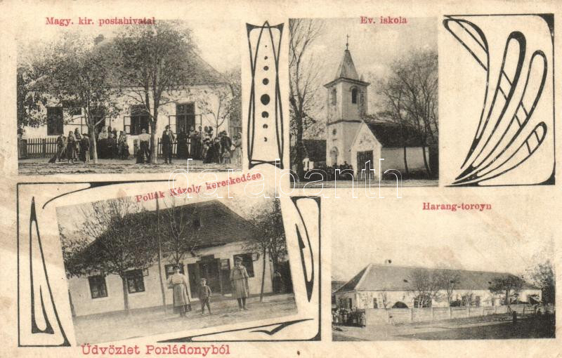 Porládony, Pollák Károly kereskedése, Postahivatal, Harang torony, Eva... https://www.darabanth.com/hu/279-Gyorsarveres/279.0/Kepeslapok/Magyarorszag~200005/Porladony-Pollak-Karoly-kereskedese-Postahivatal-Harang-torony-Evangelikus-iskola-Art-Nouv~II1437379