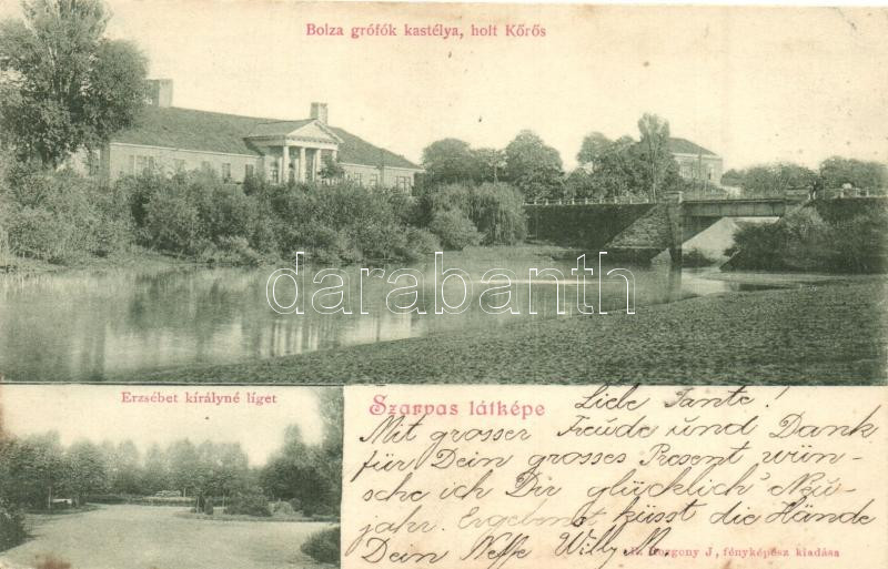 Szarvas, Gróf Bolza kastélya, Holt Kőrös, Erzsébet királyné liget (fl) https://www.darabanth.com/hu/279-Gyorsarveres/279.0/Kepeslapok/Magyarorszag~200005/Szarvas-Grof-Bolza-kastelya-Holt-Koros-Erzsebet-kiralyne-liget-fl~II1434883