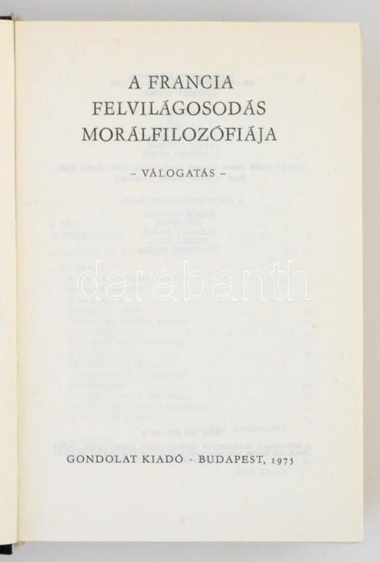 A francia felvilgosodás morálfilozófiája. Válogatás. A válogatást készítette, az utószót és a jegyzeteket írta: Ludassy Mária. Fordította: Kis János, Ludassy Mária, Petri György, Zsámboki Mária. Budapest, 1975, Gondolat Kiadó. Kiadói egészvászon kötés, kiadói papírkötés. Jó állapotban.