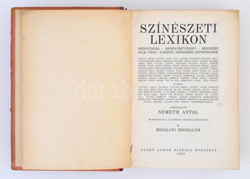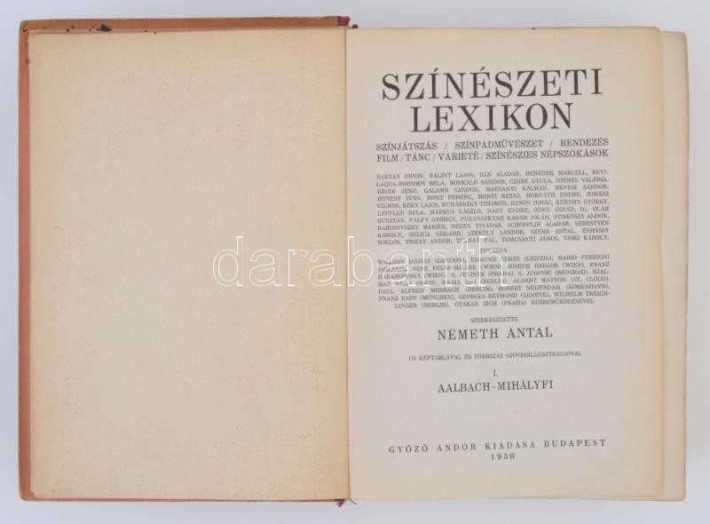 SzÃnészeti Lexikon I-II. SzÃnjátszás, szÃnpadművészet, rendezés, film, tánc, varieté, szÃnészies népszokások. Szerk.: Németh Antal. Budapest, 1930, GyÅ‘zÅ‘ Andor. Kiadói aranyozott félvászon kötés, kissé viseltes állapotban, kopottas borÃtóval, kopottas, sérült gerinccel, és sérült kötéssel.