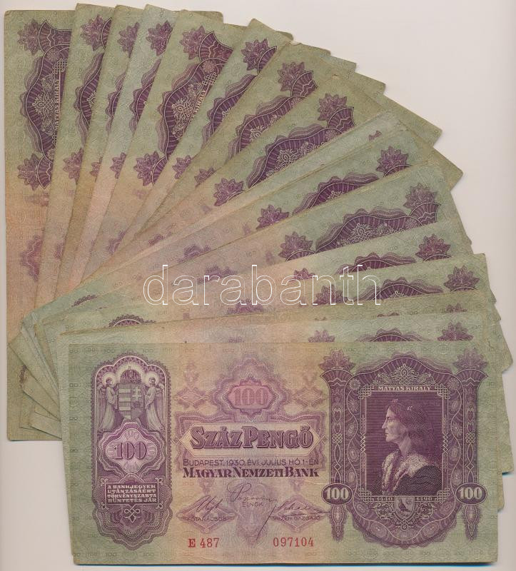 1930. 100P (30x) T:III,III- https://www.darabanth.com/hu/279-Gyorsarveres/279.0/Numizmatika/Magyar-bankjegyek~300007/1930-100P-30x-TIII-III-~II1434057