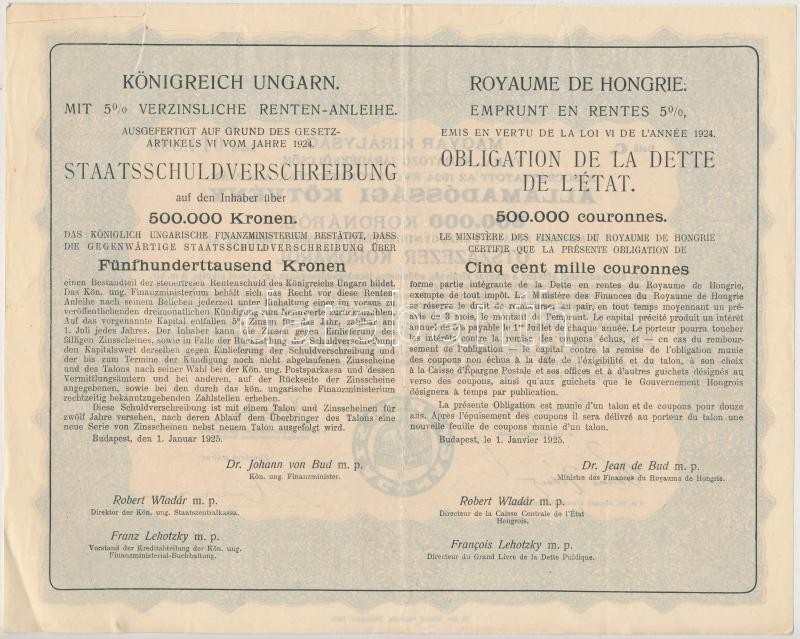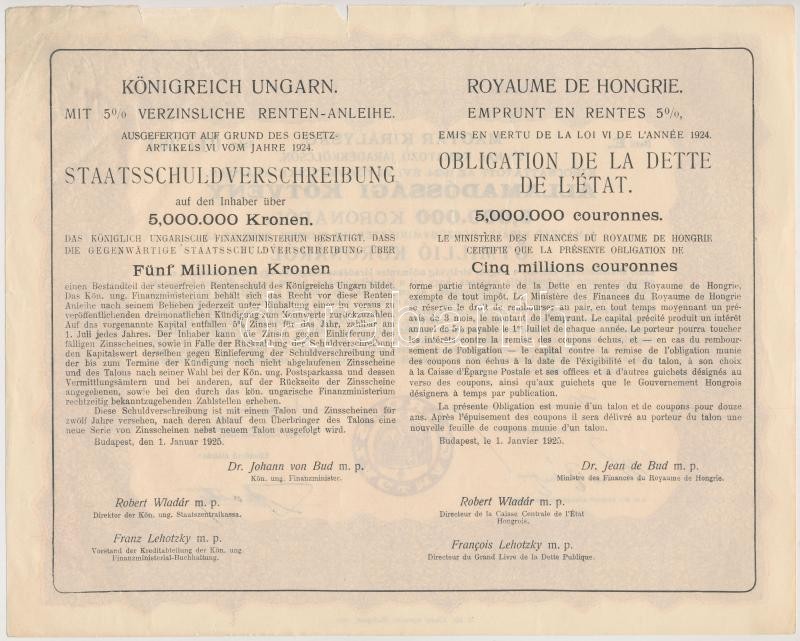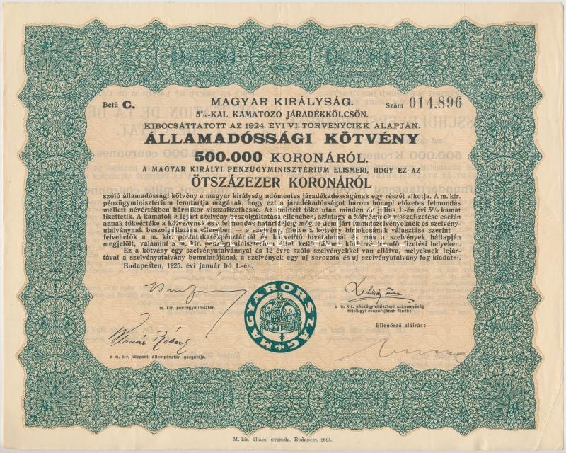 Budapest 1925. "Magyar Királyság 5%-kal kamatozó Járadékkölcsön Államadóssági Kötvény" 125.000K, 250.000K, 500.000K, 1.000.000K, 5.000.000K és 10.000.000K-ról szelvények nélkül T:II-III