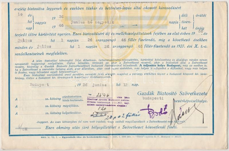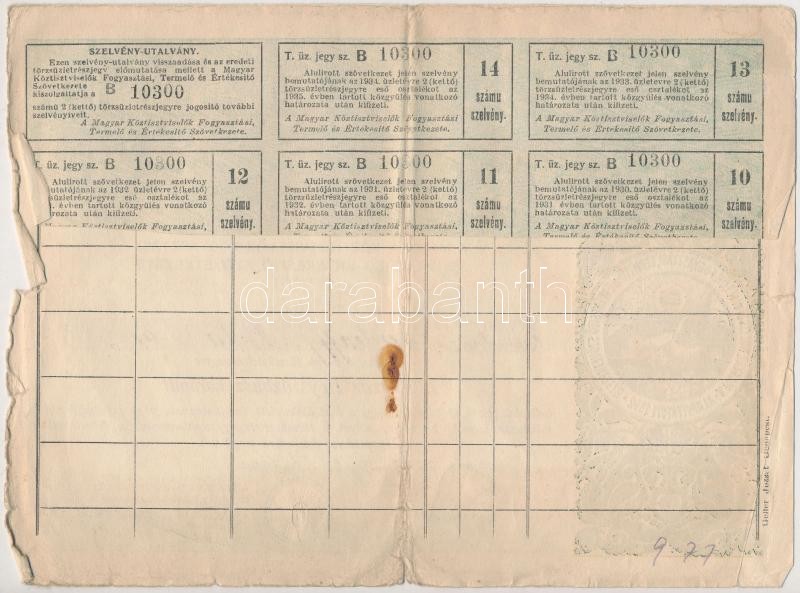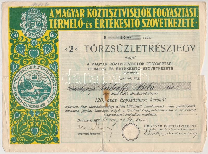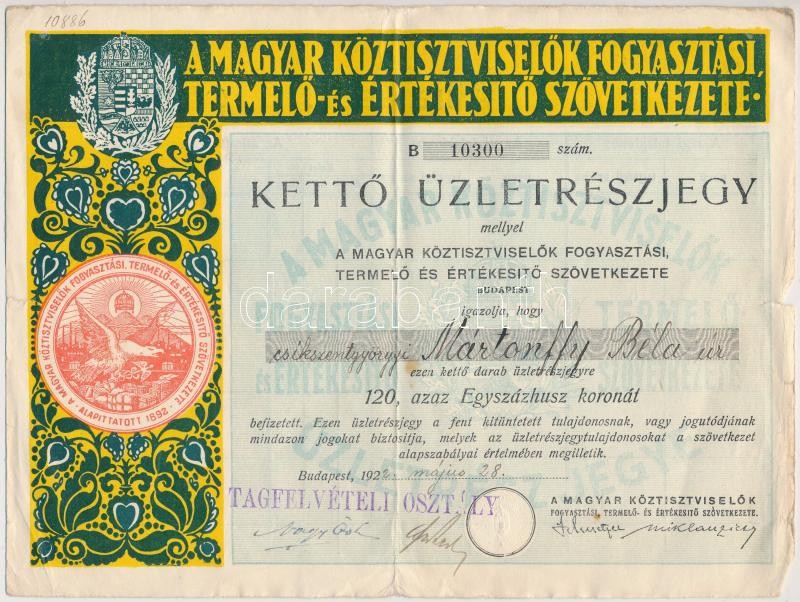 Vegyes részvény, nyeremény- és biztosítási kötvény tétel: 1922-1923. "A Magyar Köztisztviselők Fogyasztási, Termelő- és Értékesítő Szövetkezete" (3xklf), 1906. "A Magyar Jelzálog-Hitelbank" nyereménykötvénye 100K-ról, 1936. "Gazdák Biztosító Szövetkezete" biztosítási kötvény tűz- és betöréses-lopás esetére T:III,III-