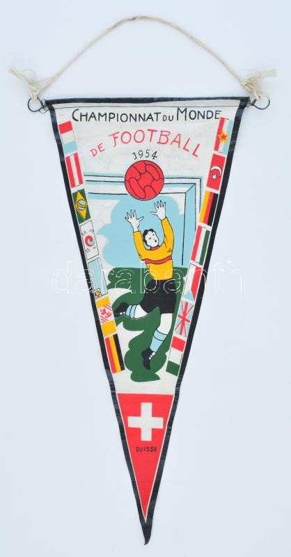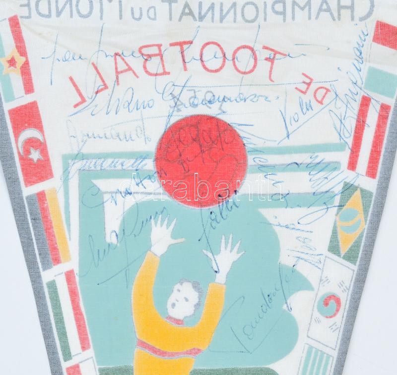 1954 A svájci labdarúgó világbajnokság zászlója, rajta az olasz válogatott focisták aláírásával Guido Vincenzi, Giovanni Giacomazzi, Maino Neri, Ermes Muccinelli, Egisto Pandolfini , Carlo Galli, Gino Cappello, Benito Lorenzi, Giovanni Viola és mások /