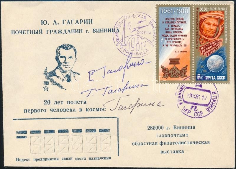 1981 Jurij Gagarin családtagjainak aláírásai jubileumi emlékborítékon: felesége, Valentyina (1935- ) és lányai: Jelena (1959- ) és Galina (1961- ) Gagarina /