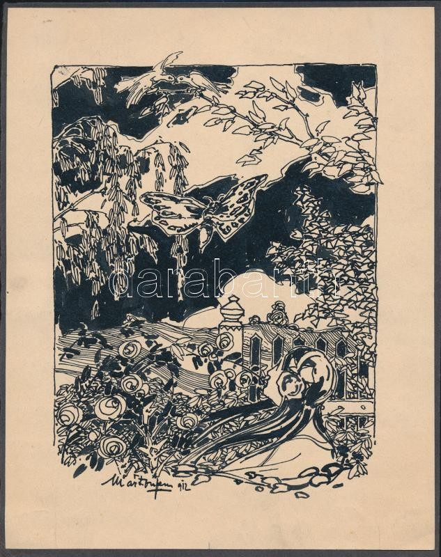 Leírás: 1912 Márton Ferenc (1884-1940):Tündérkert. Tus. papír, jelzett, 23x18 cm